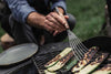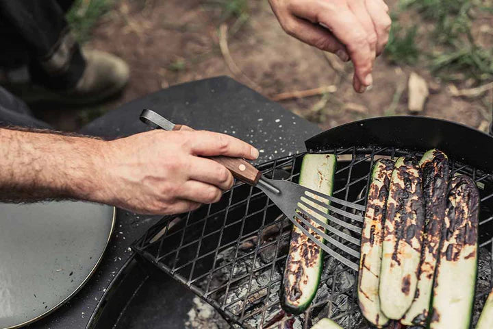 Flip delicate fish and other foods with precision. Designed to hang and work with our Cowboy Fire Pit Grill, the Fish Spatula is crafted with hand-forged stainless steel and fitted with a smooth, natural walnut handle that keeps cool over high heat. Designed for comfort and safety when working around fire and hot coals.