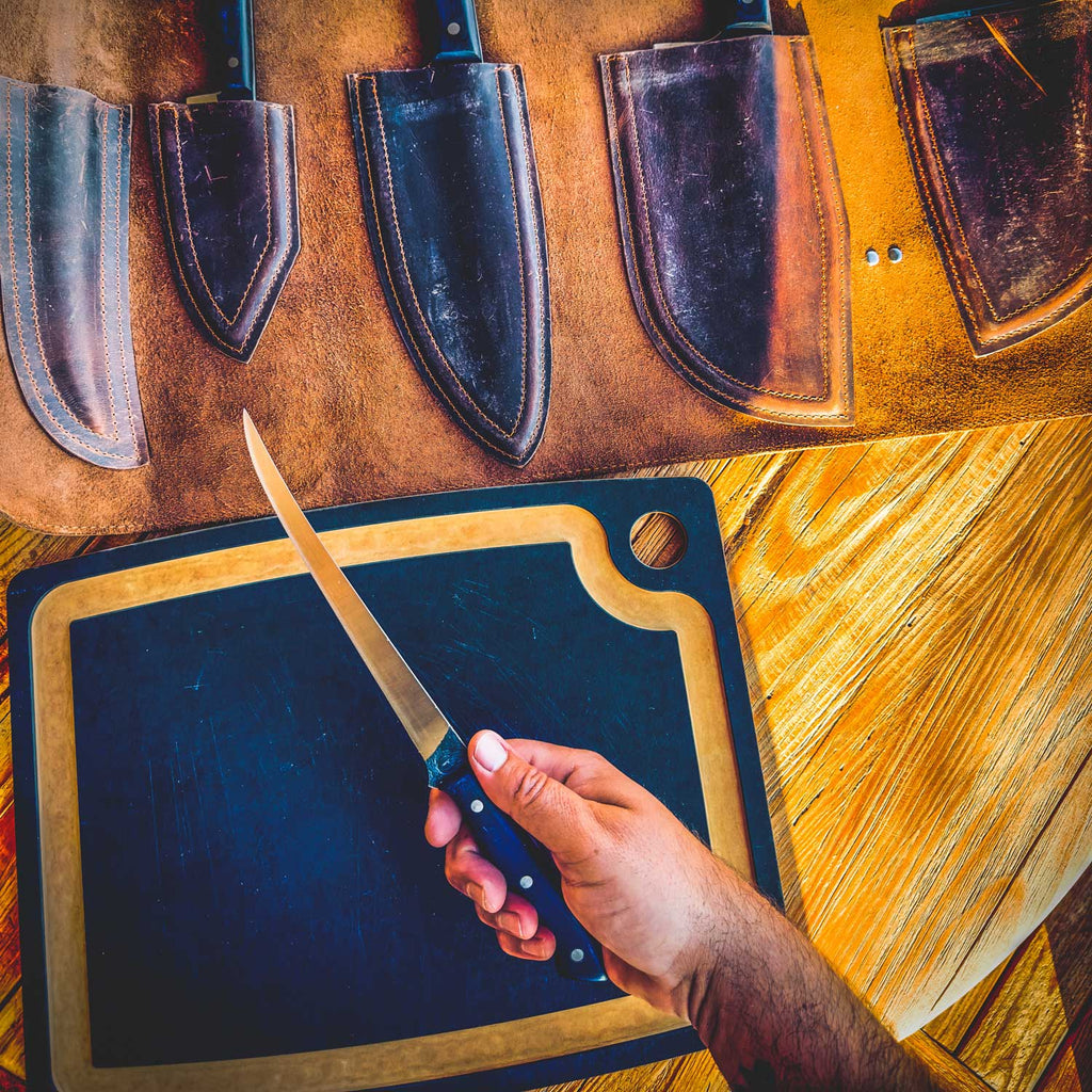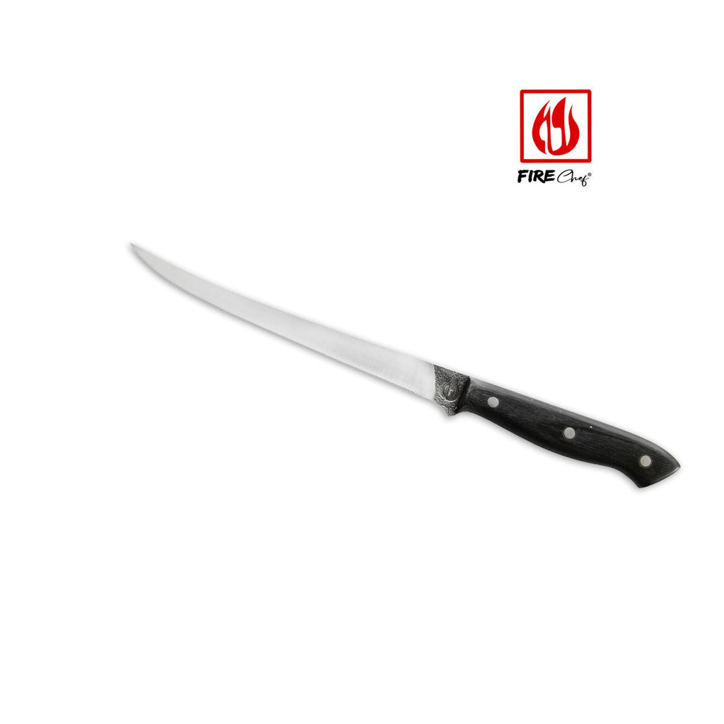 The 5th piece to Oz Braai's highly acclaimed FireChef Chef’s range, the Fillet knife is used for all those fish filleting needs! Our Fillet knives are thinner and more flexible than most other knives, with our blade measuring 7.5 inches. It has a prominent upward curve along the blade and a sharply curved tip. Because the blade is thinner, this knife is perfect for removing scales from a fish while flexing around the contours of its body without damaging the delicate meat. Or cutting those perfectly sliced fish fillets. It is designed with German Steel, so it will not easily rust up on you while using it in salt water.