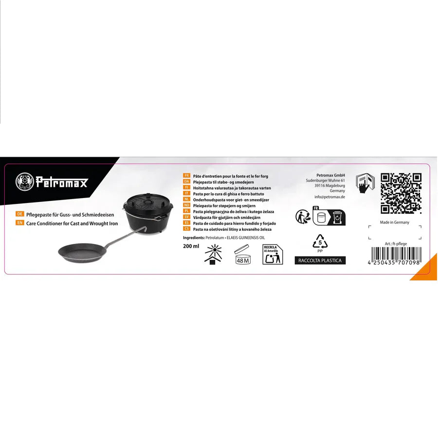 Made from natural ingredients, the paste maintains and preserves the pre-treated surface (seasoned finish) of Petromax fire pots and cast iron Dutch Oven and pans. It is also excellent for baking non-pretreated cast iron Dutch Oven.